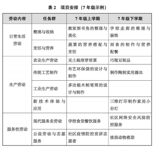 1—2 年級側(cè)重在日常生活勞動、生產(chǎn)勞動內(nèi)容中選擇,服務(wù)性勞動不做要求 ,有條件 的學(xué) 校可 結(jié)合 實際 情況 開展。3—4 年級及以上各學(xué)段應(yīng)涵蓋三類勞動內(nèi)容。5—6年級的清潔與衛(wèi)生勞動要求,可與同學(xué)段其他任務(wù)群融合實施,同時結(jié)合日常課外勞動和家庭勞動要求開展。7—9 年級結(jié)合相關(guān)任務(wù)群開展生涯規(guī)劃教育。