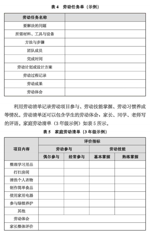 針對具體的勞動學(xué)習(xí)與實踐的目標和內(nèi)容,可采取相應(yīng)的方法進 行評價。例如:日常生活勞動可以勞動清單 為主要依據(jù),家校合作共同評價;生 產(chǎn)勞 動可以勞動任務(wù)單 為主要依據(jù),結(jié)合勞動任務(wù)的完成過程和勞動成果情況進行綜合評價;服務(wù)性勞動可以勞動檔案袋為主 要依據(jù),結(jié)合服務(wù)對象的評語和多方面的材料進行綜合評價。